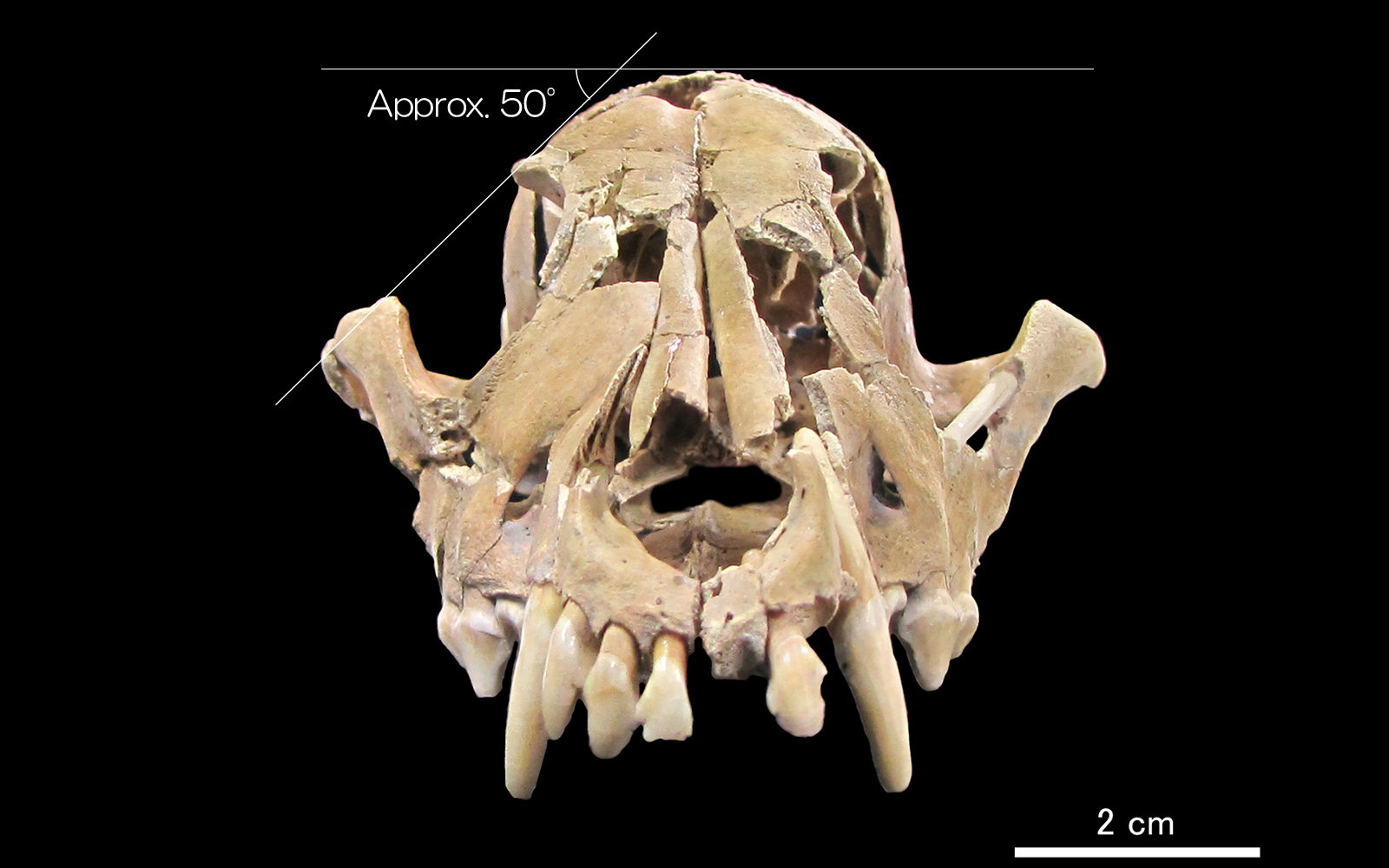 Viewing the cranium from the front, the angle between a line drawn from the postorbital process to the zygomatic bone and a horizontal line drawn across the top of the cranium is more acute than it is in modern dog breeds—another feature shared with previously reported Jomon dog craniums. The eyes of the Jomon dog were likely more almond-shaped than modern dog breeds, and it probably had fierce facial features reminiscent of its wolf ancestors.