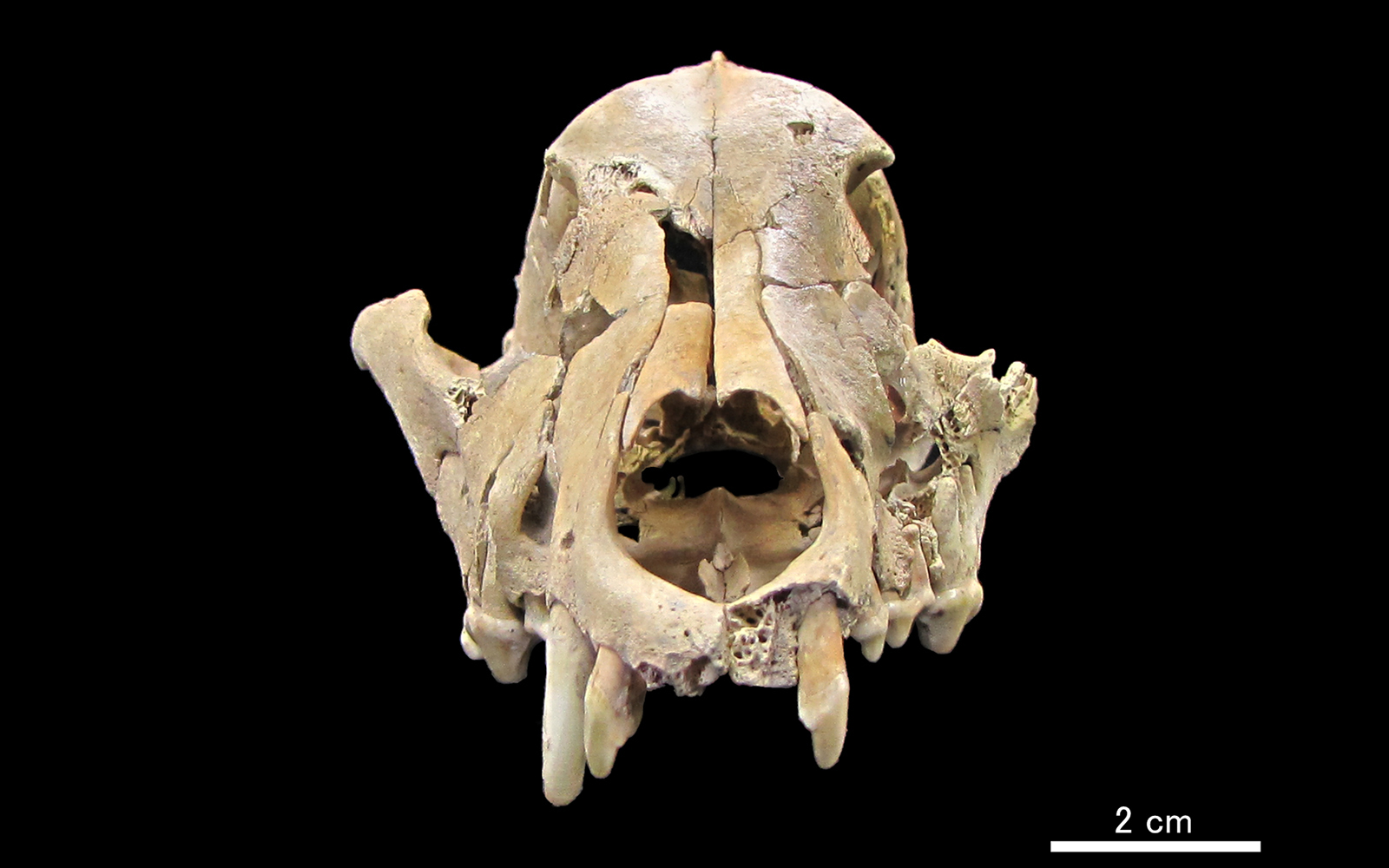 Viewing the cranium from the front, the angle between a line drawn from the postorbital process to the zygomatic bone and a horizontal line drawn across the top of the cranium is more acute than it is in modern dog breeds—another feature shared with previously reported Jomon dog craniums. The eyes of the Jomon dog were likely more almond-shaped than modern dog breeds, and it probably had fierce facial features reminiscent of its wolf ancestors.