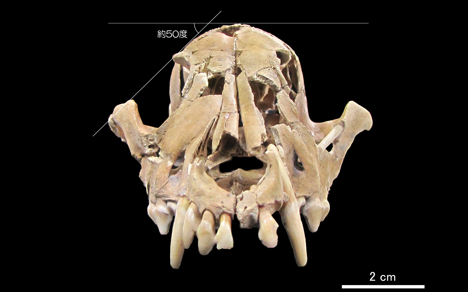1号犬頭蓋骨の前面 1号犬頭蓋骨の前面 1号犬頭蓋骨の前面 頭骨前面と目の比較 前面からみると頬骨と後眼窩突起と結ぶ線と水平線のなす角度が現生犬種よりも狭い点も、既報の縄文犬頭蓋骨と共通する特徴といえます。縄文犬は、おそらく現生犬種よりもつり目で、祖先種オオカミも彷彿とさせる精悍な顔つきをしていたとおもわれます。