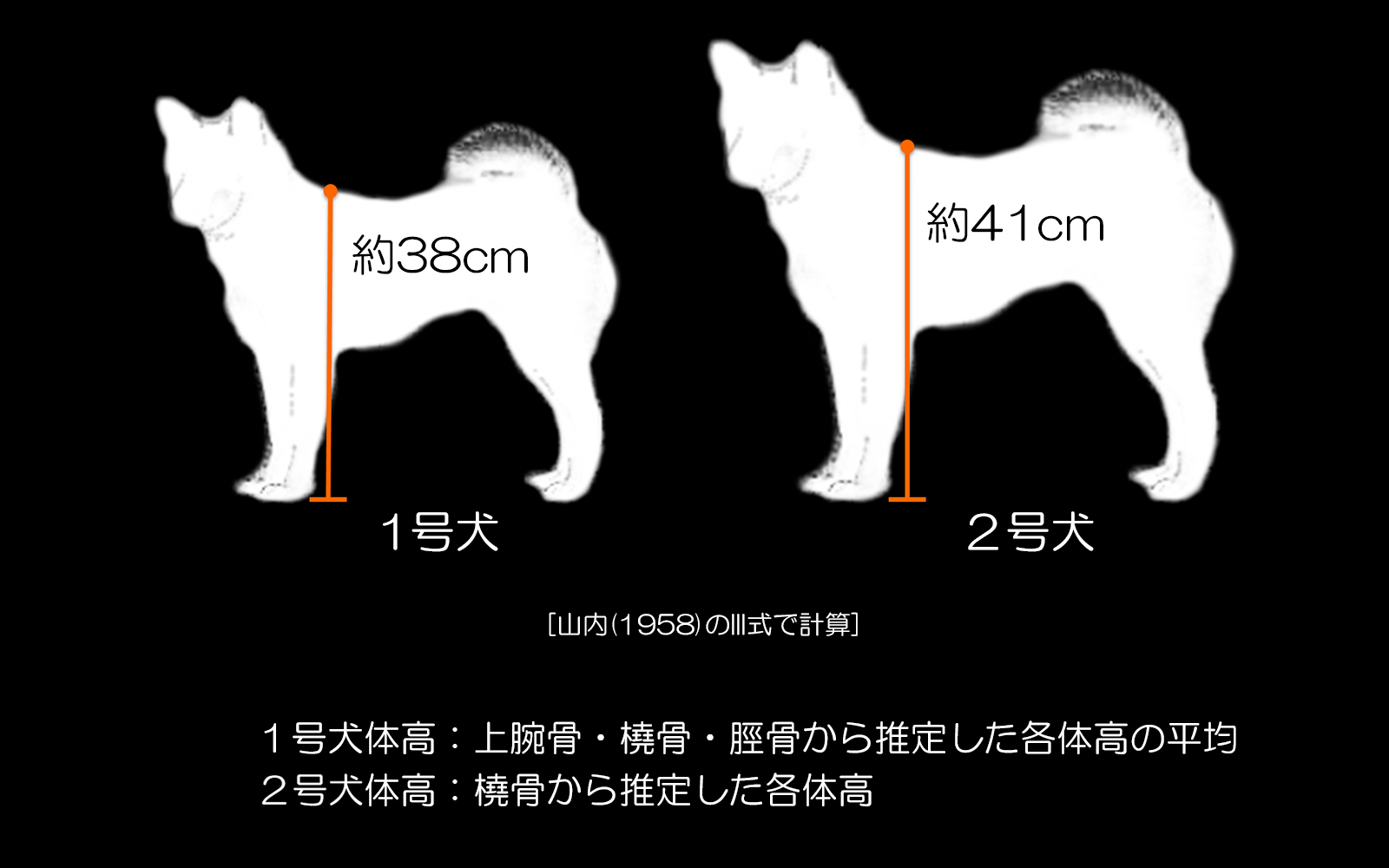 1号犬と2号犬の体高復元 1号犬と2号犬の体高復元 1号犬と2号犬の体高復元 縄文犬と列島在来犬種の体高分布 縄文犬の多くは現代の柴犬級の小型犬であったと考えられます。橈骨の計測値から、2号犬の体高は約41cmと推定されました。